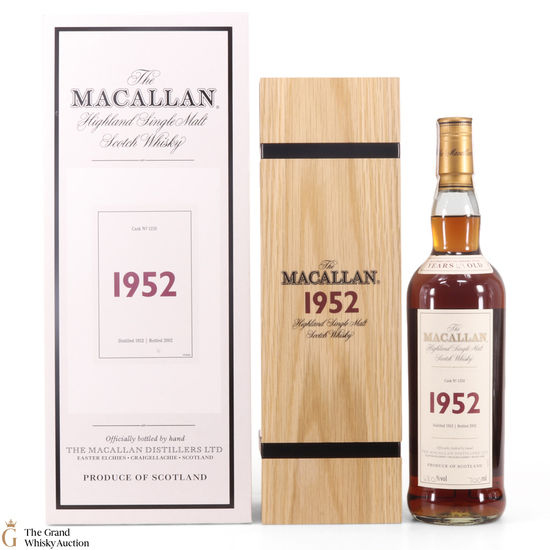 This is a beautiful bottle of 1952 vintage Macallan. It was distilled in 1952 and aged in single Sherry cask #1250, for an impressive 49 years, before being bottled in 2002 at 48% ABV. This bottle is an impressive vintage release from The Macallan Fine & Rare series. It comes with a smart wooden presentation case.