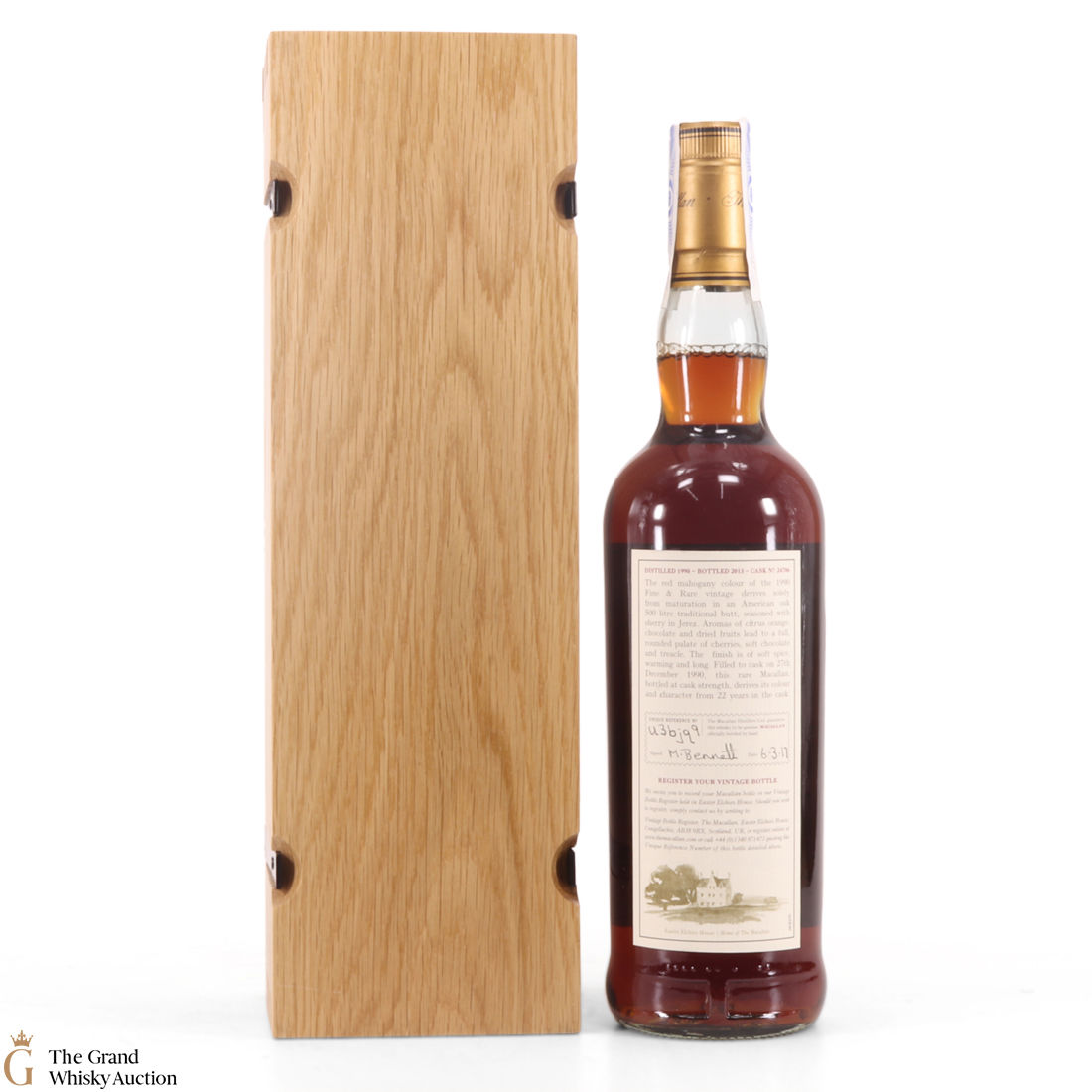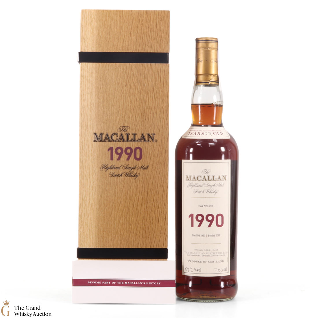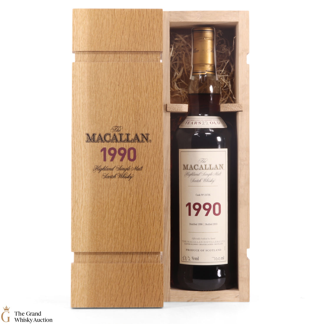 This is a beautiful bottle of 1990 vintage Macallan. It was distilled in 1990 and aged in single Sherry cask #24706, for an impressive 22 years, before being bottled in 2013 at 58.2% ABV. This bottle is an impressive vintage release from The Macallan Fine & Rare series. It comes with a smart wooden presentation case.