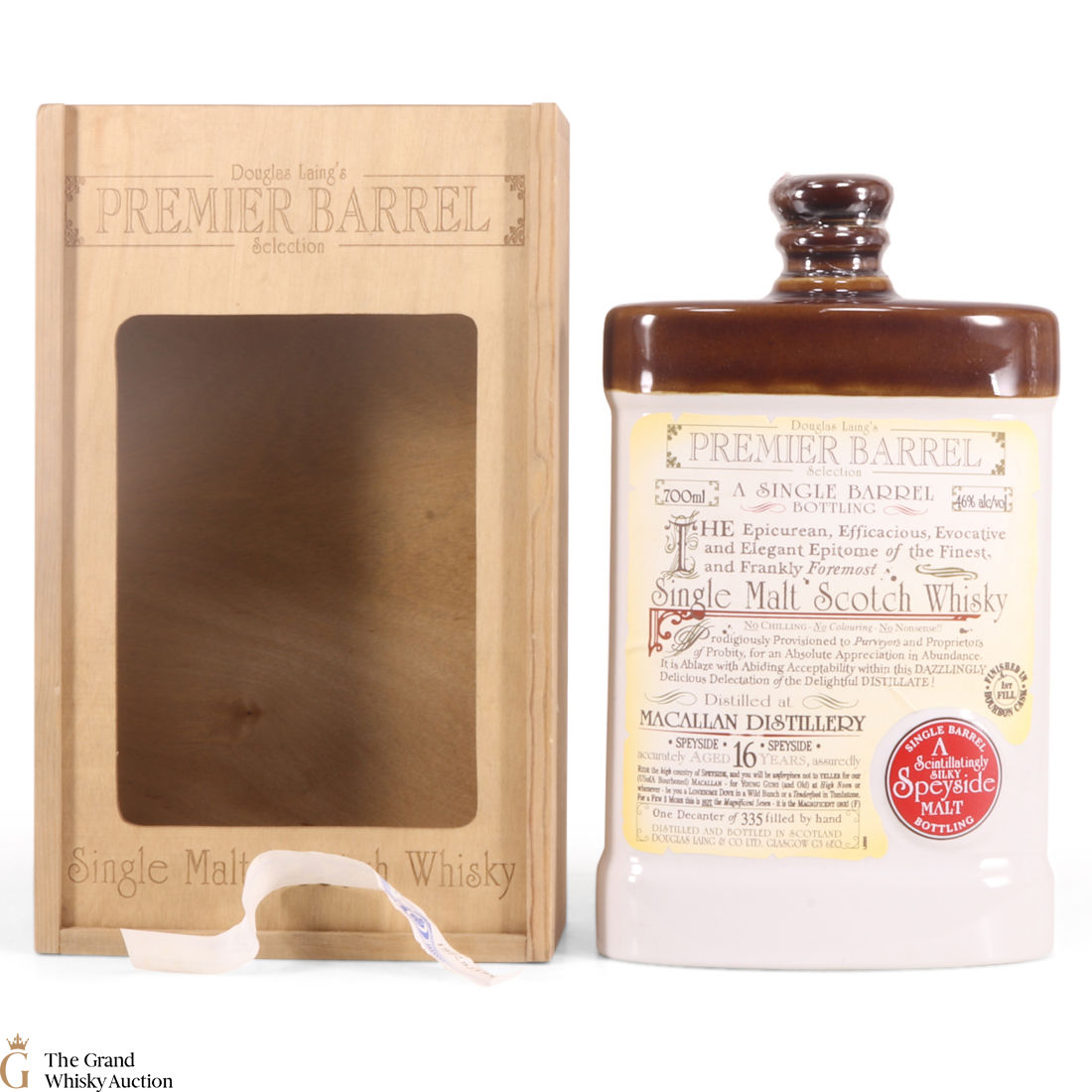 A single barrel bottling of 16-year-old Macallan single malt. This is one of only 335 bottles filled by Douglas Laing, from a first fill bourbon cask.