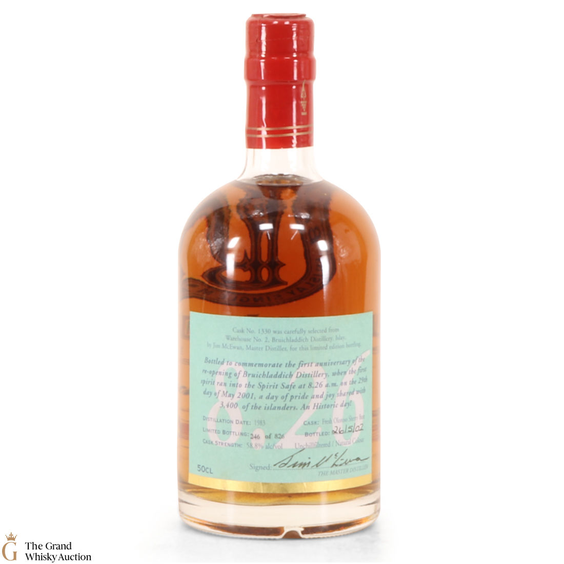 This rare Bruichladdich Islay Single Malt was bottled to mark the first anniversary of the reopening of Bruichladdich - the first spirit ran into the Spirit Safe at 8.26 am on the 29th of May, 2001.