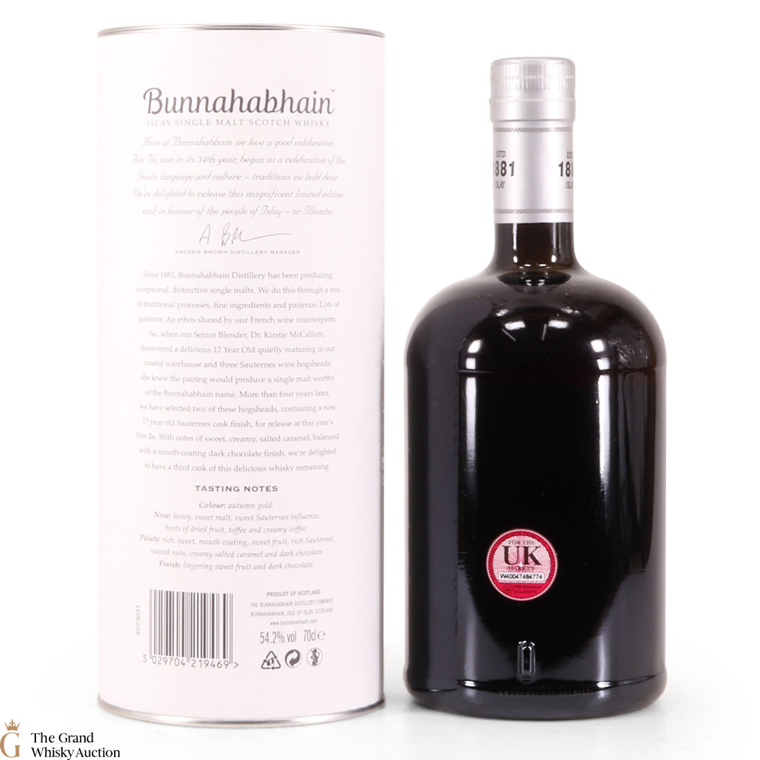This limited edition single malt from Bunnahabhain Distillery has been matured for 17 years. For the last 5 years, the whisky was finished in Sauternes hogsheads. This release is one of 3 by Bunnahabhain for Fèis Ìle 2019. It has been bottled at 54.2% ABV. This is one of only 1118 bottles produced.