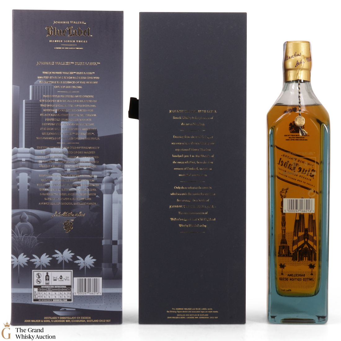 A limited-edition bottling of Johnnie Walker Blue Label with a cityscape of Barcelona on the bottle label and box. The design captures the essence of the vibrant city of Barcelona.