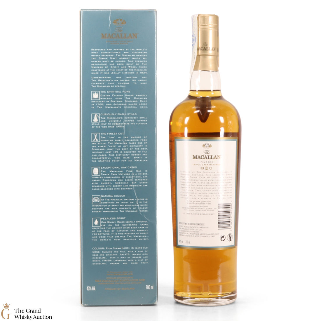 This 15 year old single malt is part of Macallan's Fine Oak, triple cask matured range. It has been matured for fifteen years in three oak cask types; Europen oak seasoned with sherry, American oak seasoned with sherry and American oak seasoned with bourbon. It is 'a rich straw whisky' with notes of cinnamon, rich chocolate and dried fruits. This bottle is an import.