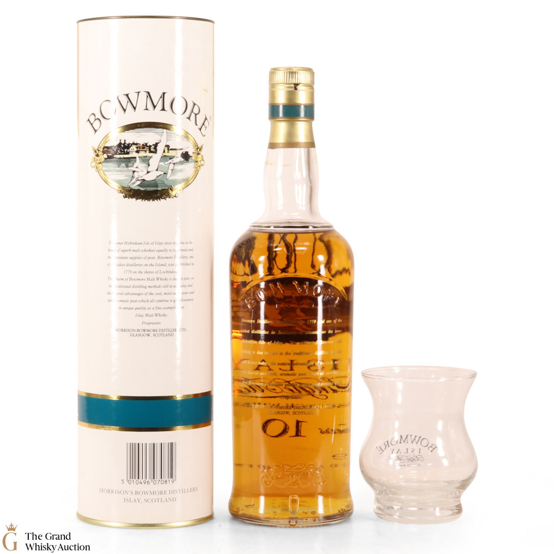 This striking older-style presentation of Bowmore 10 Year Old single malt from the now highly sought screened label bottlings that were released between 1990 and 1995.