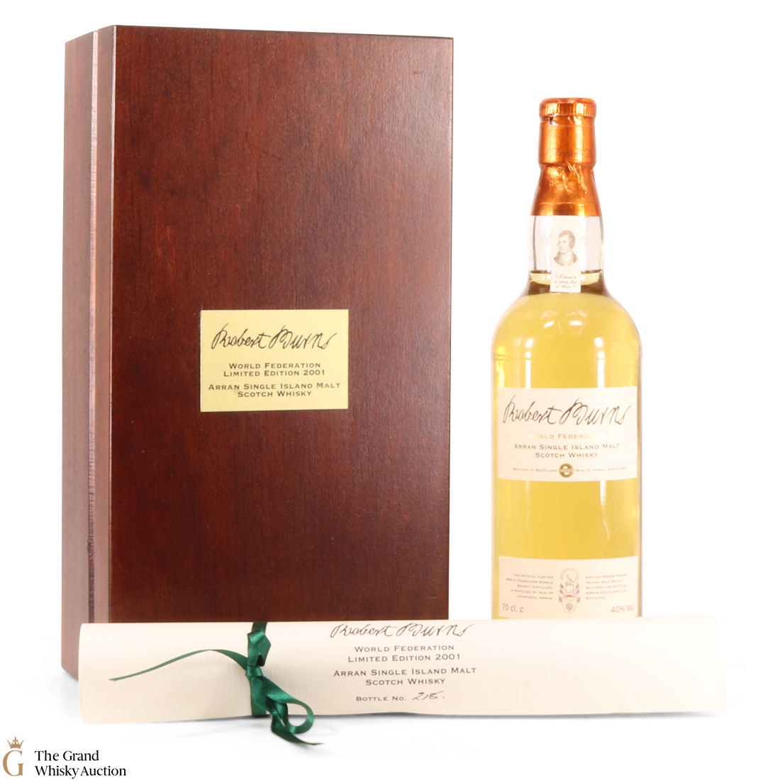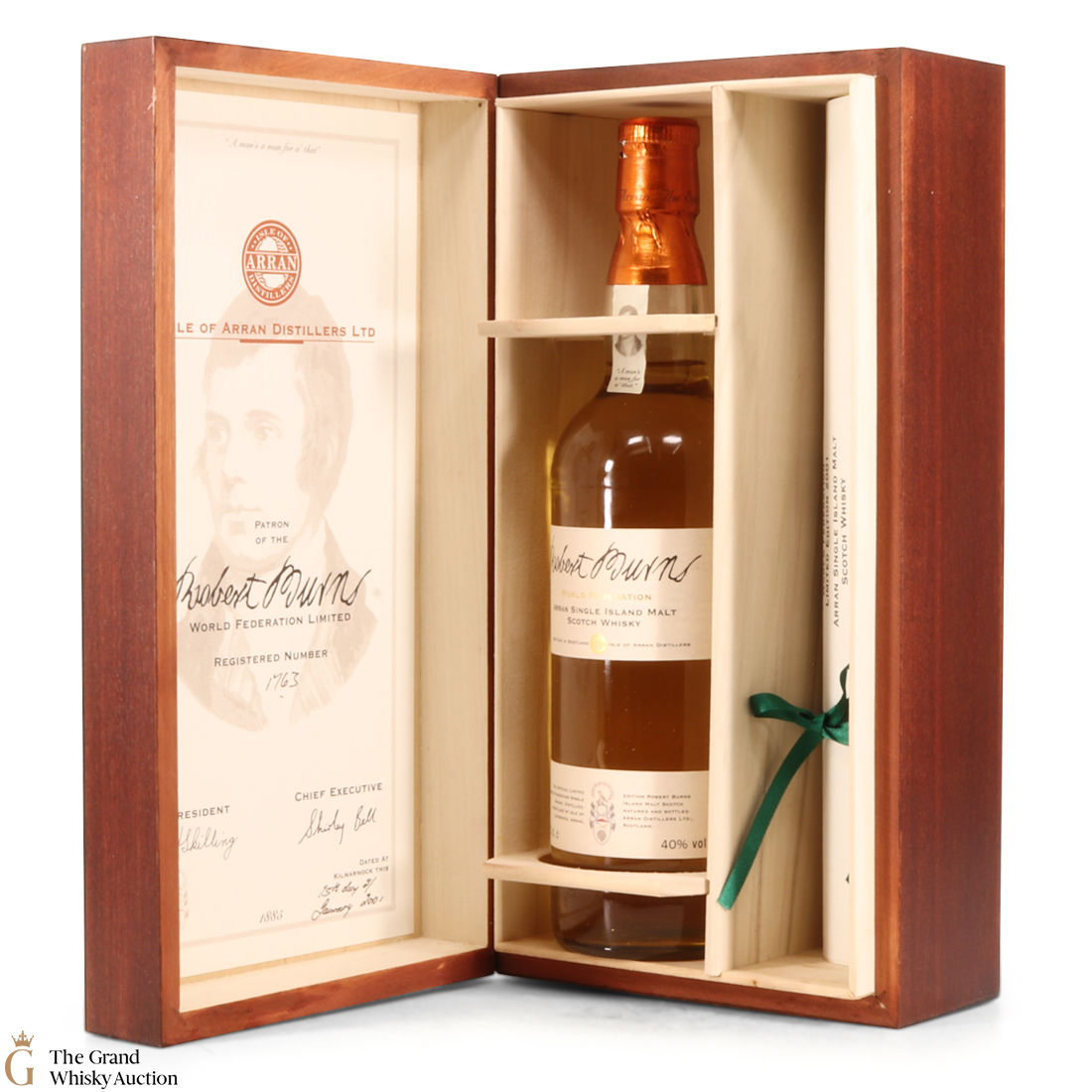 This 2001 bottling is limited edition from the Arran Distillery to mark the Patron of the Robert Burns World Federation Limited on the 25th January 2001. Registered number is 1763 which has been signed by the President J.H.Skilling and Chief Executive Shirley Bell.