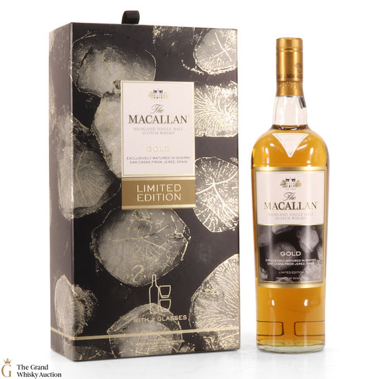 A stylish Macallan gift pack. It contains a 70cl bottle of the Gold expression from the Macallan 1824 Series, and two limited-edition branded Macallan whisky tumblers.