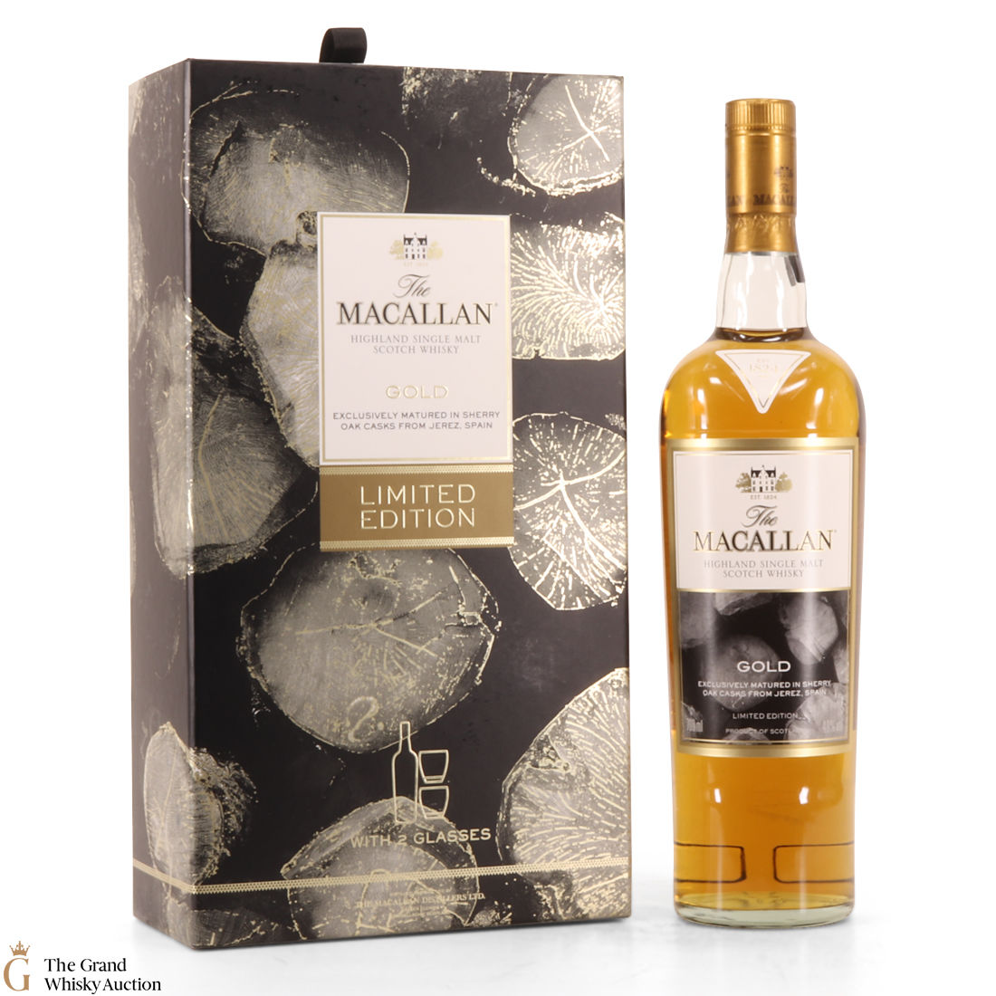 A stylish Macallan gift pack. It contains a 70cl bottle of the Gold expression from the Macallan 1824 Series, and two limited-edition branded Macallan whisky tumblers.