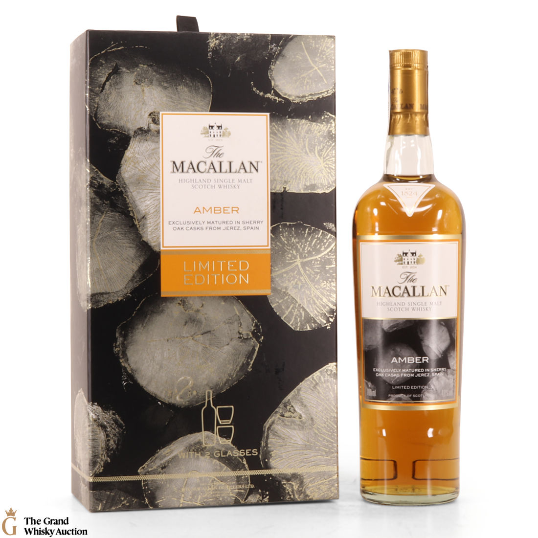 A stylish Macallan gift pack. It contains a 70cl bottle of the Amber expression from the Macallan 1824 Series, and two limited-edition branded Macallan whisky tumblers.
