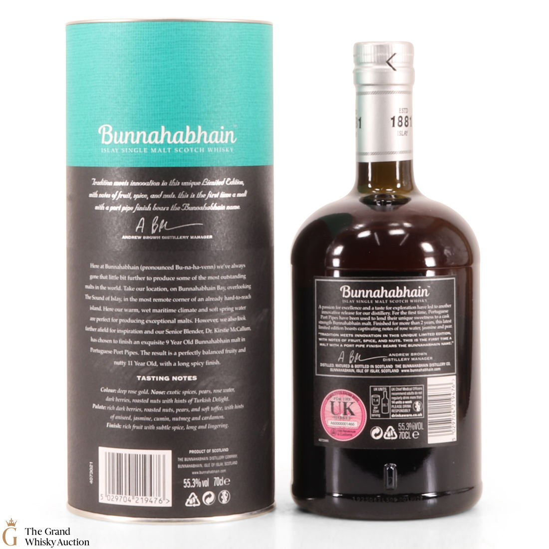 This Bunnahabhain limited release was distilled in 2007 and was aged in Warehouse 8 for 11 years. Initially matured in whisky refill hogshead casks and then filled into port pipes in 2016 for a final 2 years of maturation. It was bottled at 55.3% ABV. This is one of 1578 bottles produced.