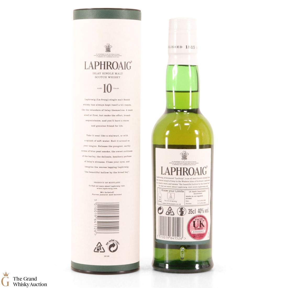 A half bottle of the iconic, medicinal 10 year old from Islay's bestselling distillery, Laphroaig.  In making Laphroaig, malted barley is dried over a peat fire.  The smoke from this peat, found only on Islay, gives Laphroaig a particularly rich flavour.