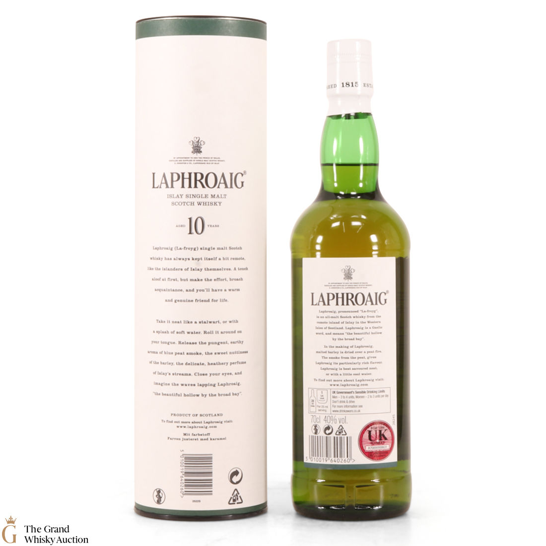 A 70cl of the medicinal 10 year old from Islay's bestselling distillery, Laphroaig. In making Laphroaig, malted barley is dried over a peat fire. The smoke from this peat, found only on Islay, gives Laphroaig its particularly rich flavour.