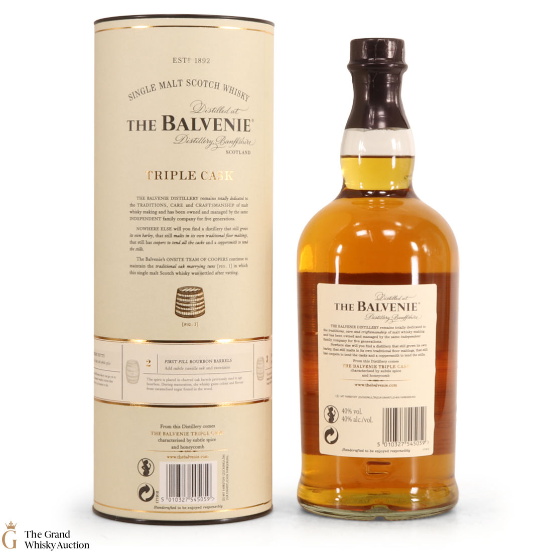 The 12 year old Triple Cask expression is part of Balvenie's travel retail range. It is made with whisky matured in three different types of cask, namely first-fill American oak barrels, traditional refill casks and first-fill Oloroso Sherry butts. Following the maturation, the whisky is married together to create a cohesive, flavoursome expression packed with orchard fruit, custard cream and cinnamon spice. This is a 1L bottling.