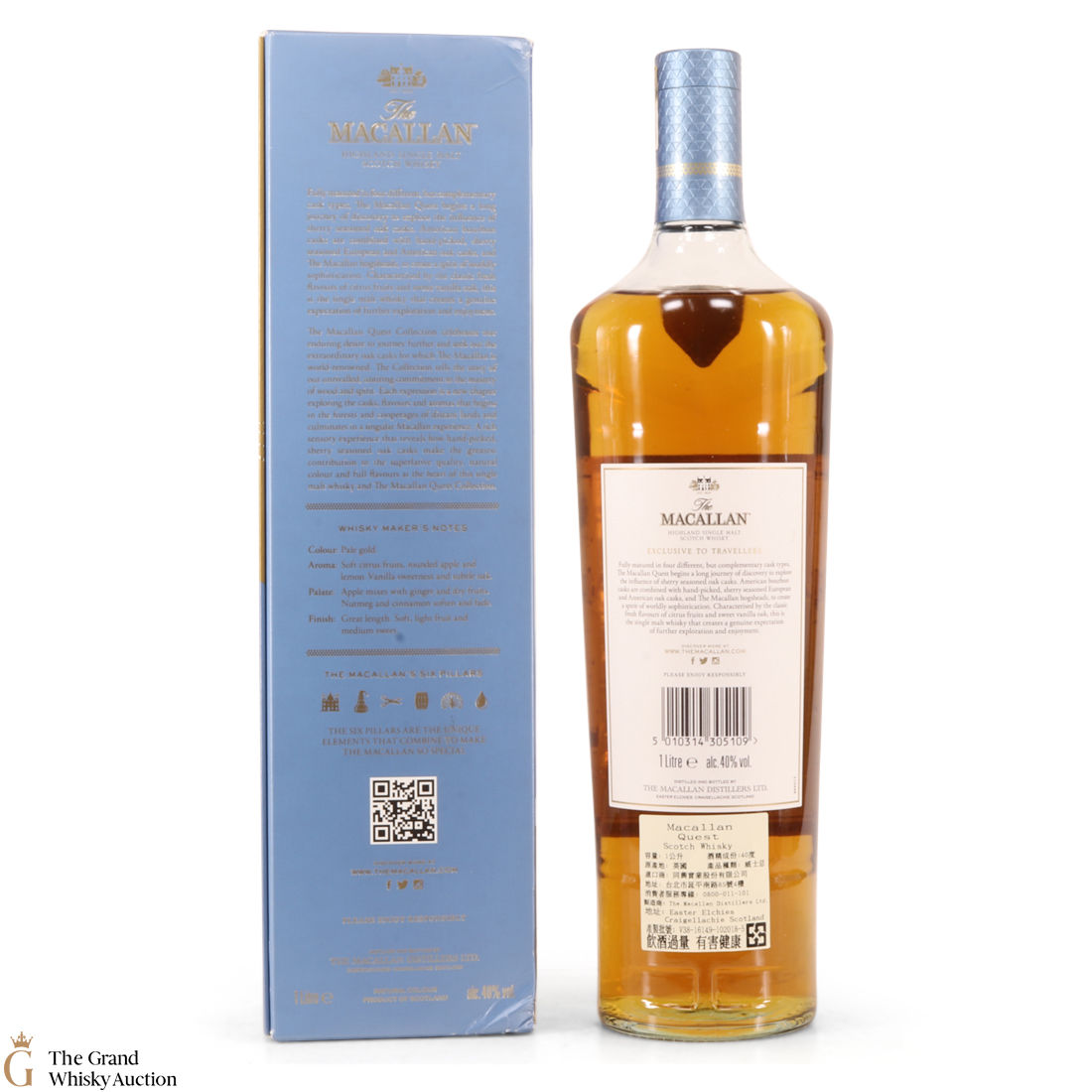 The Macallan Quest was originally released for the Travel Retail market.  It was designed to pay homage to the journey taken by The Macallan to source the best oak across over 20,000 miles.  It is made from a combination of four varieties of cask - bourbon casks, sherry-seasoned European oak casks, sherry-seasoned American oak casks, and hogsheads. The Quest packaging has a blue sky which is said to symbolise 'the start of the journey where the world is a canvas and the sky is the limit' for Macallan.