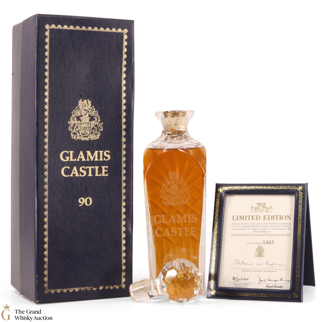 A Royal Brierley full lead crystal decanter specially blended 25 year old whisky which was released in 1990. It was commissioned by Glamis Castle to Commemorate the 90th Birthday of Her Majesty Queen Elizabeth the Queen Mother. It is presented in an elegant crystal decanter and comes with a silk lined presentation box.