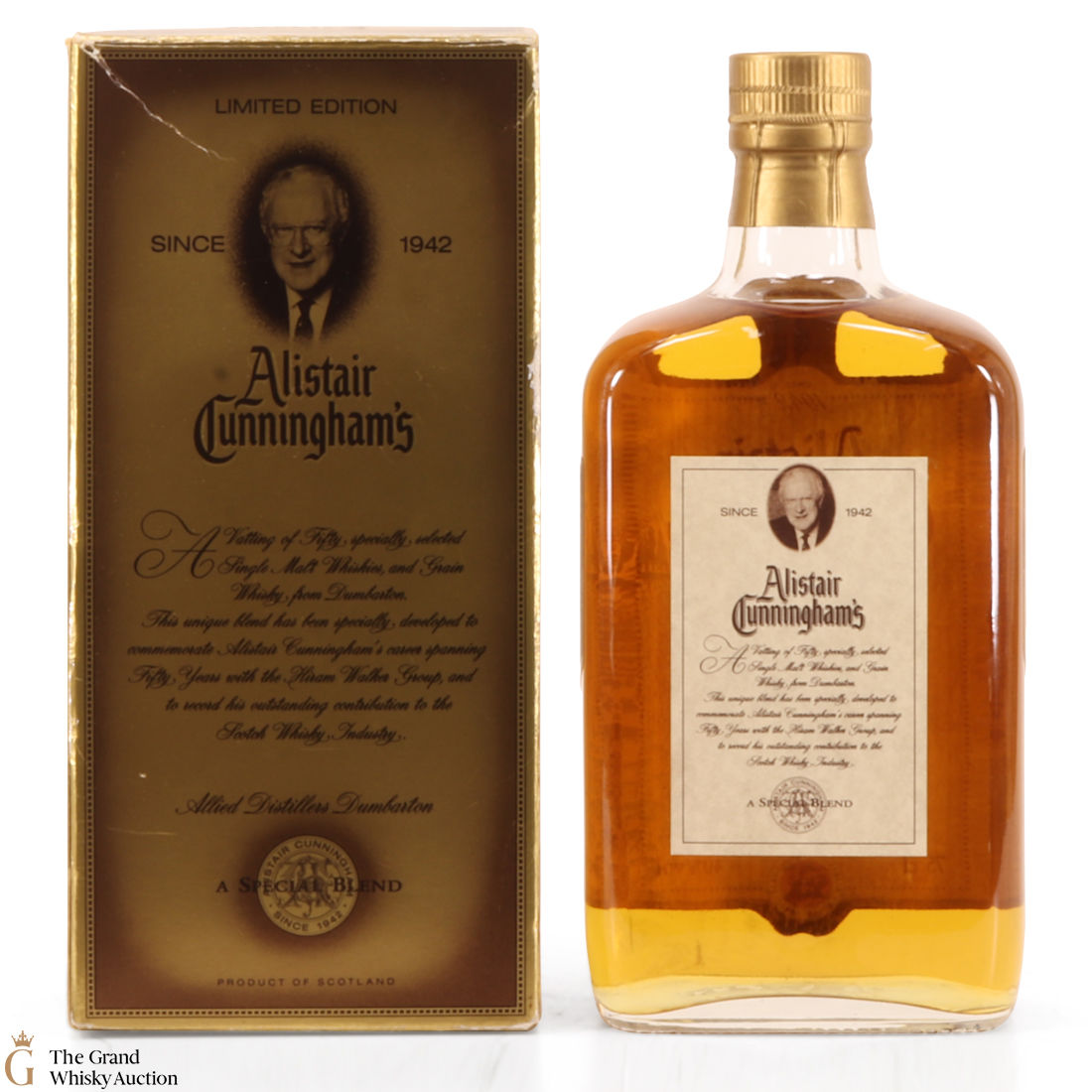A special edition blended whisky from Hiram Walker to commemorate Alistair Cunningham's 50th year with the company in 1995. It's not a 50 year old whisky, but instead a blend of 50 malt whiskies and grain from Dumbarton. This is a 75cl bottling.