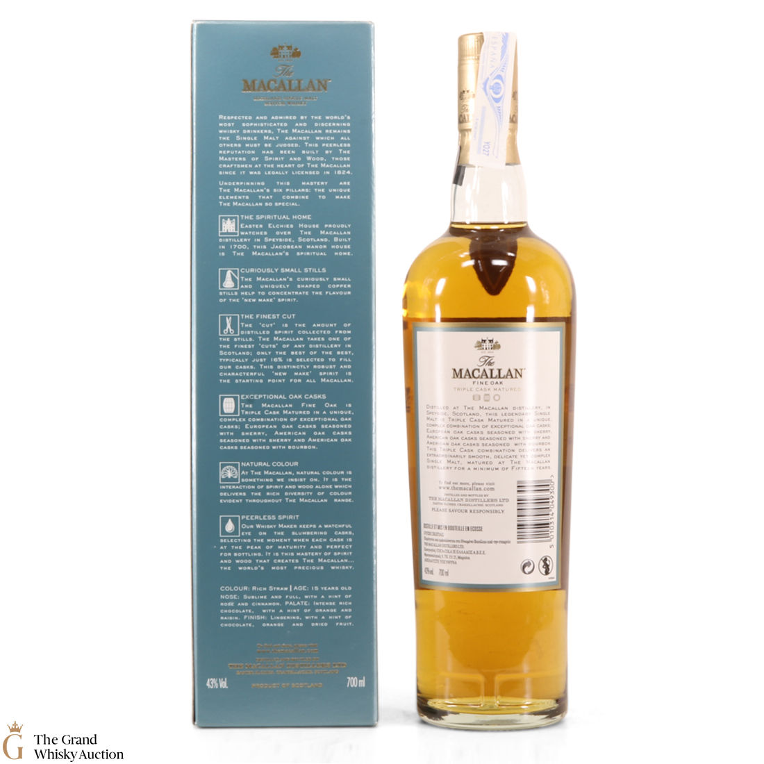 This 15 year old single malt is part of Macallan's Fine Oak, triple cask matured range. It has been matured for fifteen years in three oak cask types; Europen oak seasoned with sherry, American oak seasoned with sherry and American oak seasoned with bourbon. It is 'a rich straw whisky' with notes of cinnamon, rich chocolate and dried fruits. This bottle is an import.