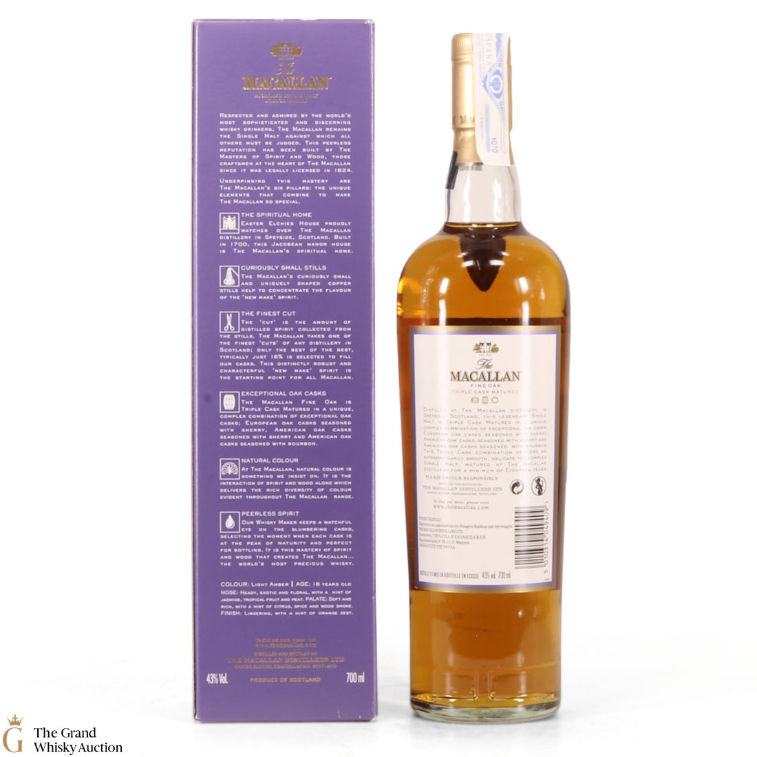 An 18 year old single malt, part of Macallan's Fine Oak range. It has been matured for eighteen years in three oak cask types; Europen oak seasoned with sherry, American oak seasoned with sherry and American oak seasoned with bourbon. This complex combination of casks has created a light amber single malt with tropical flavours balanced with wood smoke.