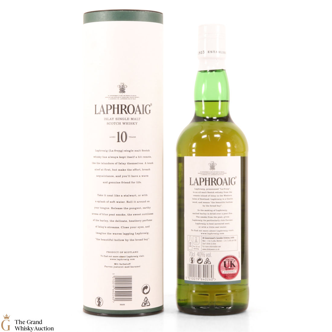 A 70cl of the medicinal 10 year old from Islay's bestselling distillery, Laphroaig. In making Laphroaig, malted barley is dried over a peat fire. The smoke from this peat, found only on Islay, gives Laphroaig its particularly rich flavour.