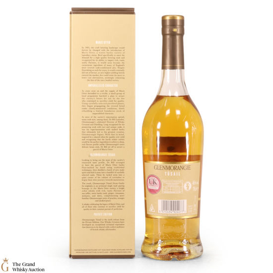 Tusail is the sixth entry in Glenmorangie's Private Collection. Made using traditionally floor-malted Maris Otter barley, this is an old-fashioned whisky backed up by Glenmorangie's modern approach to whisky-making.