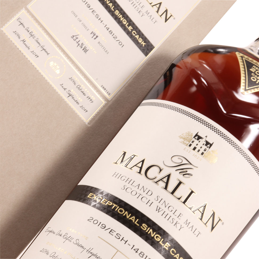 This 2019 Exceptional Single Cask from Macallan (2019/ESH – 14812/01) was distilled on the 20th of October 1997, matured for over 21 years in European Oak Refill Sherry Hogshead and was bottled on the 2nd of September 2019. This is one of a very limited production of only 198 bottles. This is another stunning single cask from Macallan.