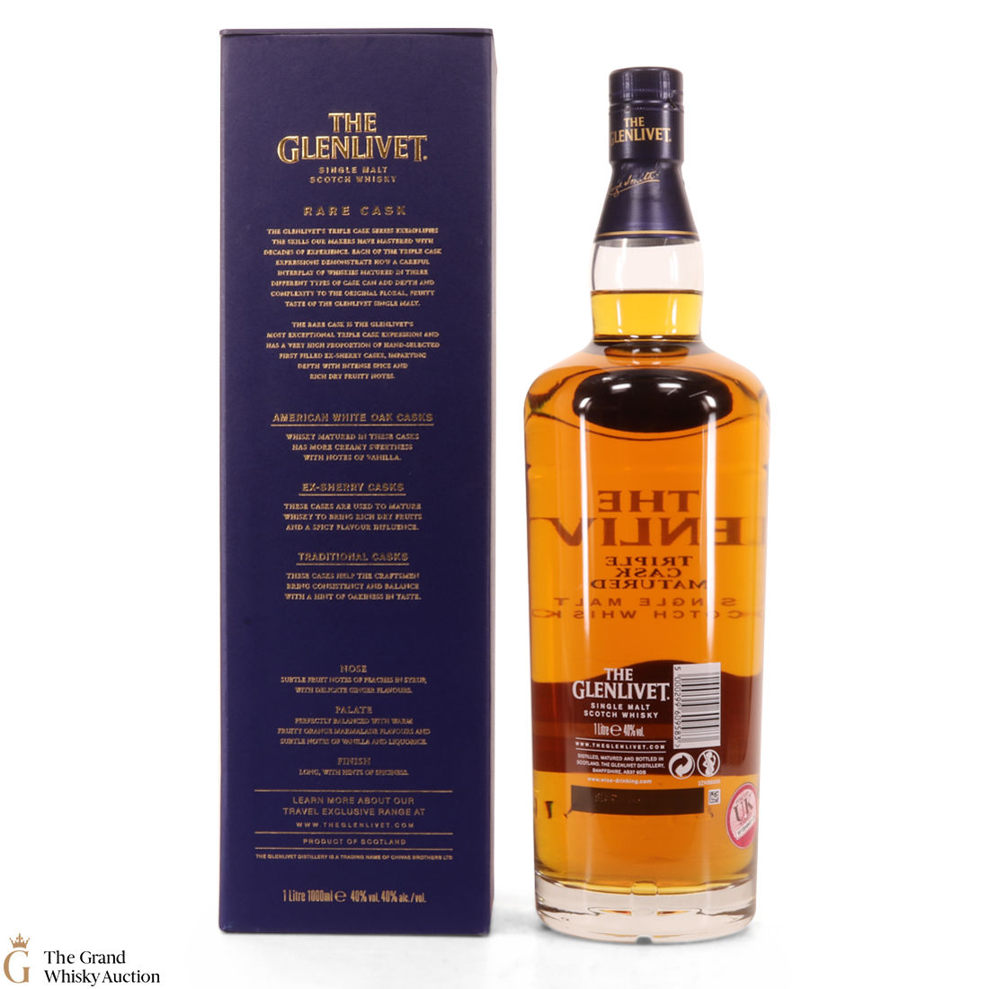 The Triple Cask Matured Rare Cask is the rich & spicy single malt whisky of the range. Hand selected casks with a higher percentage of bespoke first filled ex-sherry casks which result in rich fruit and spice flavours. The Glenlivet Rare Cask is bottled and released in uniquely numbered small batches.