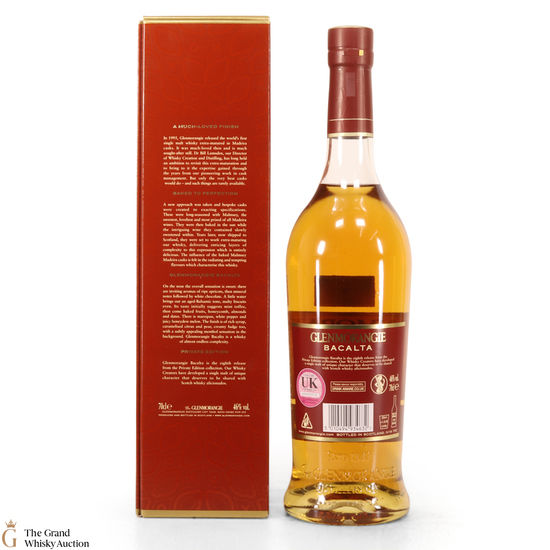 Glenmorangie Bacalta is s a single malt that is the eight release from the Private Edition collection. Matured in ex-bourbon casks and extra matured in former malmsey maderia wine casks.