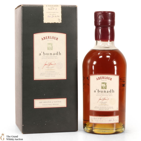 Meaning 'of the origin' in Gaelic, A'bunadh is made in homage to Aberlour's founder, James Fleming. This is batch No. 8 of the popular A'Bunadh single malt. It has been matured in Spanish Oloroso sherry butts and bottled at cask strength at 60.2% creating a dark luxurious whisky.