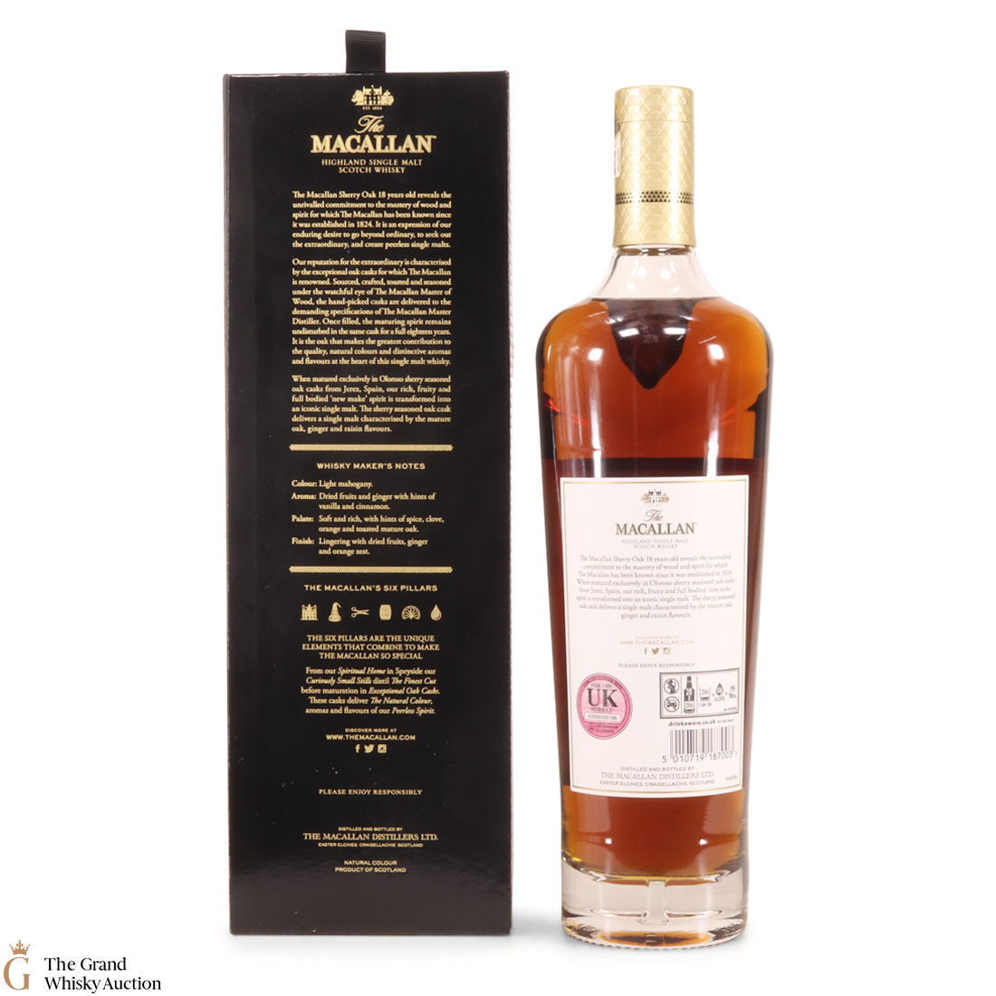 This annual release of The Macallan's popular 18 Year Old Sherry Oak is matured exclusively in sherry seasoned casks, built from both Spanish and American oak, providing a beautifully dark flavour with rich aromas.