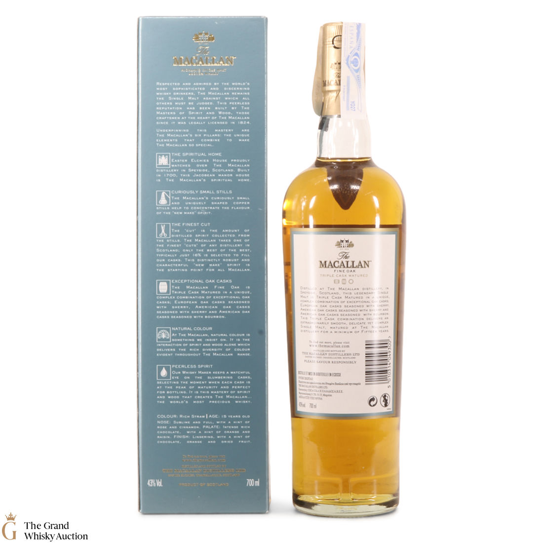 This 15 year old single malt is part of Macallan's Fine Oak, triple cask matured range. It has been matured for fifteen years in three oak cask types; Europen oak seasoned with sherry, American oak seasoned with sherry and American oak seasoned with bourbon. It is 'a rich straw whisky' with notes of cinnamon, rich chocolate and dried fruits. This bottle is an import.