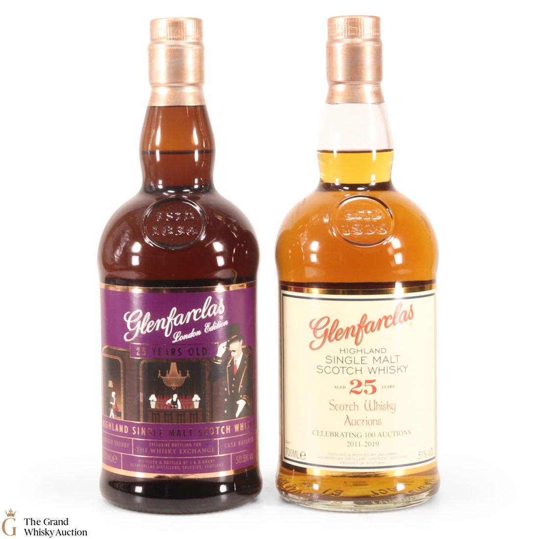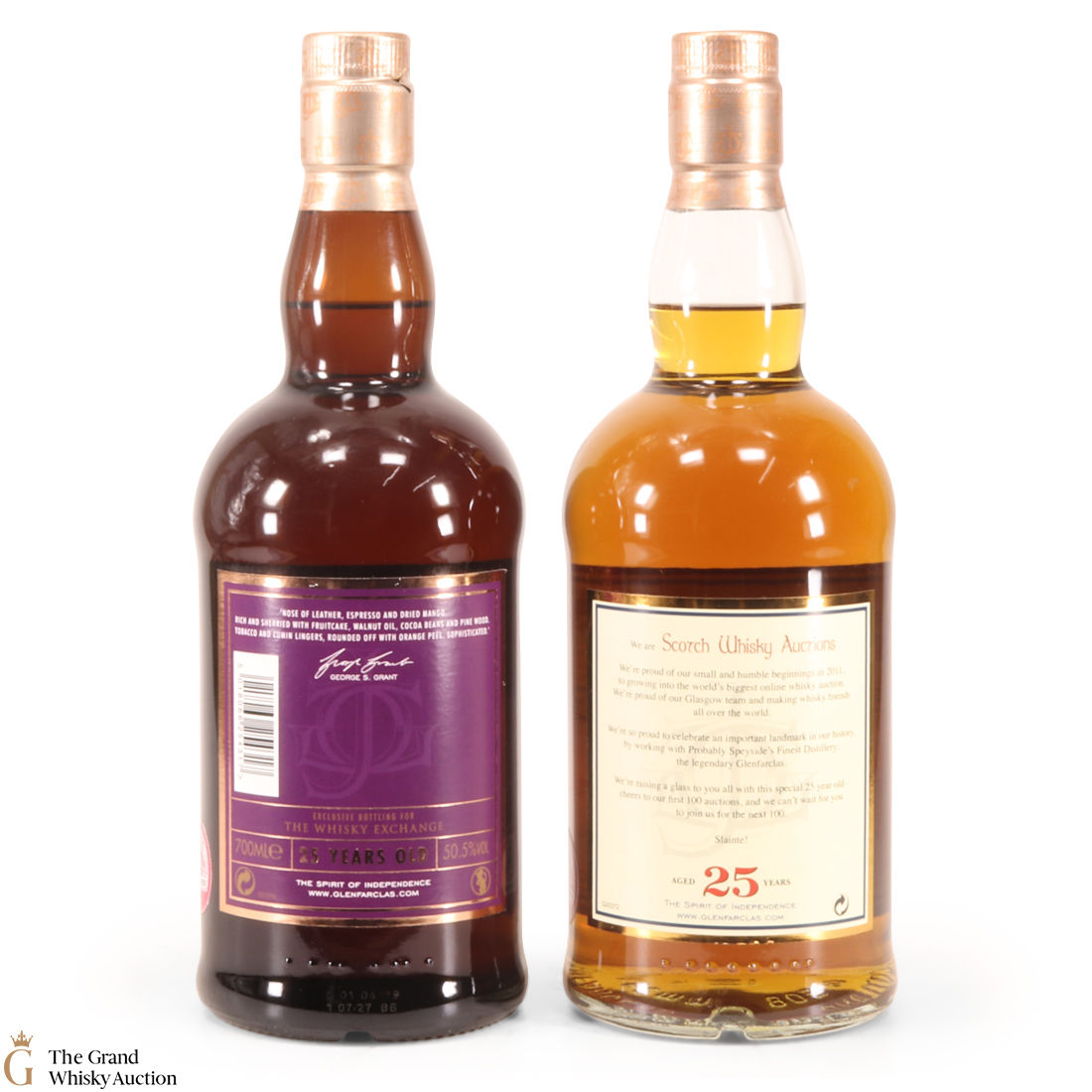 Glenfarclas - 25-Year-Old - SWA 100th Auction: This 25-year-old Glenfarclas single malt was one of 900 bottles released in 2019 to mark the SWA milestone of 100 auctions. Matured in an Oloroso Sherry Butt and bottled at 51%. 70cl.