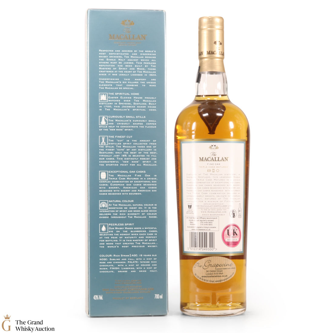 This 15 year old single malt is part of Macallan's Fine Oak, triple cask matured range. It has been matured for fifteen years in three oak cask types; Europen oak seasoned with sherry, American oak seasoned with sherry and American oak seasoned with bourbon. It is 'a rich straw whisky' with notes of cinnamon, rich chocolate and dried fruits. This bottle is an import.