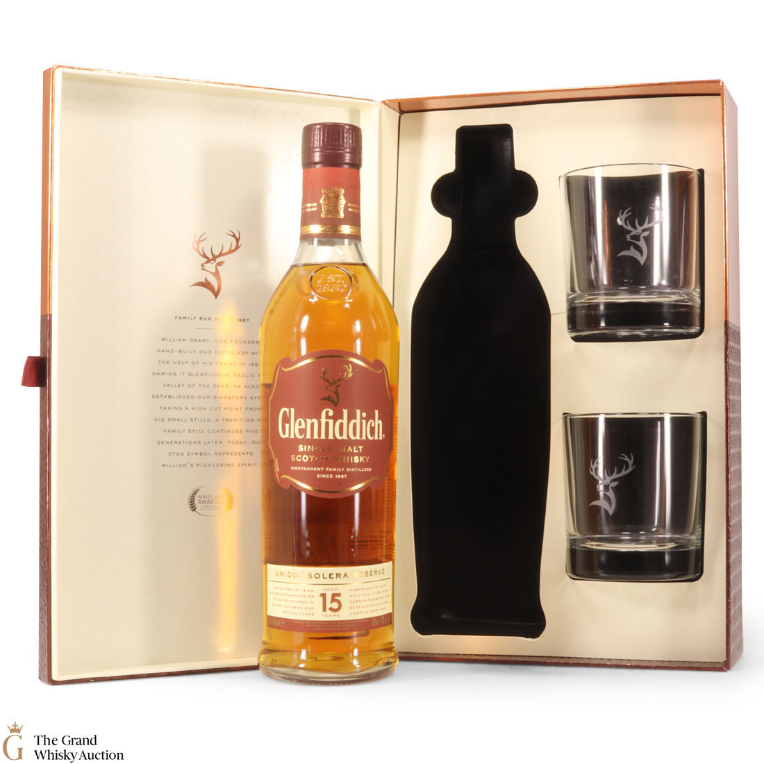 This gift set includes 2 x branded glasses and 1 x Glenfiddich - 15-Year-Old - Solera Reserve 70cl.