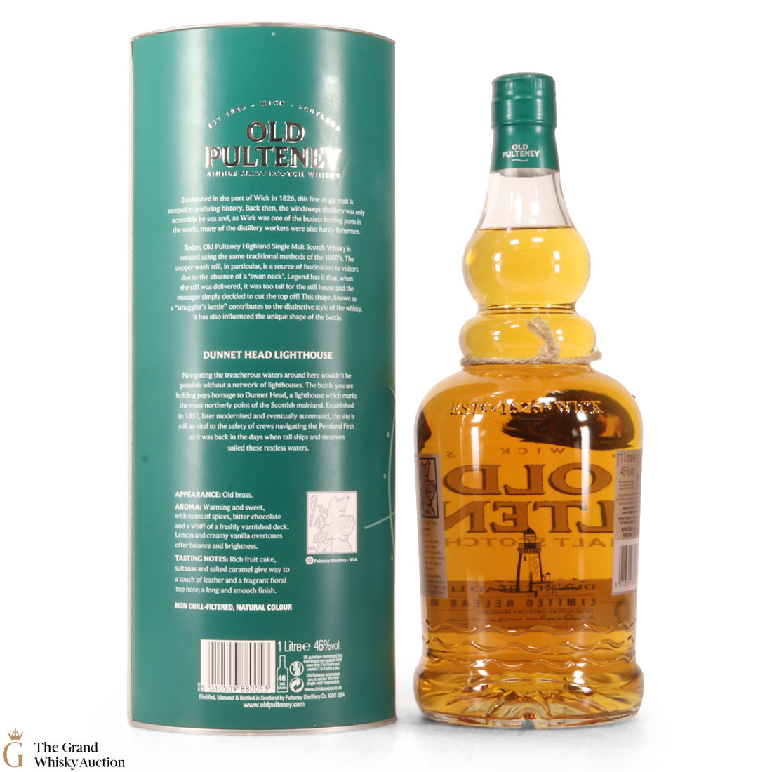Named for the Dunnet Head lighthouse, this Old Pulteney single malt Scotch whisky was released as part of a travel retail series. It's an American & European oak ex-bourbon-cask matured single malt. This is a 1L bottling.