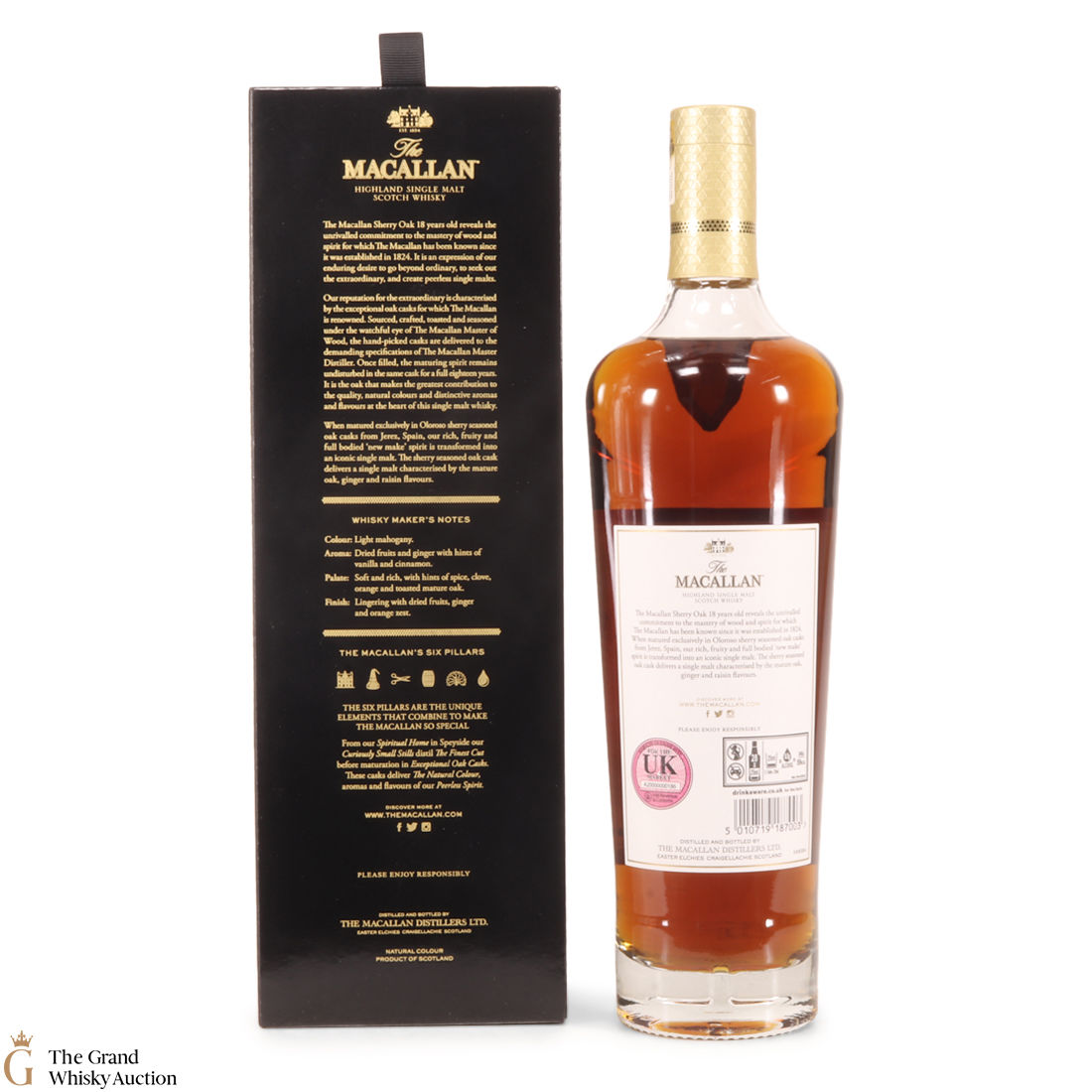 This annual release of The Macallan's popular 18 Year Old Sherry Oak is matured exclusively in sherry seasoned casks, built from both Spanish and American oak, providing a beautifully dark flavour with rich aromas.