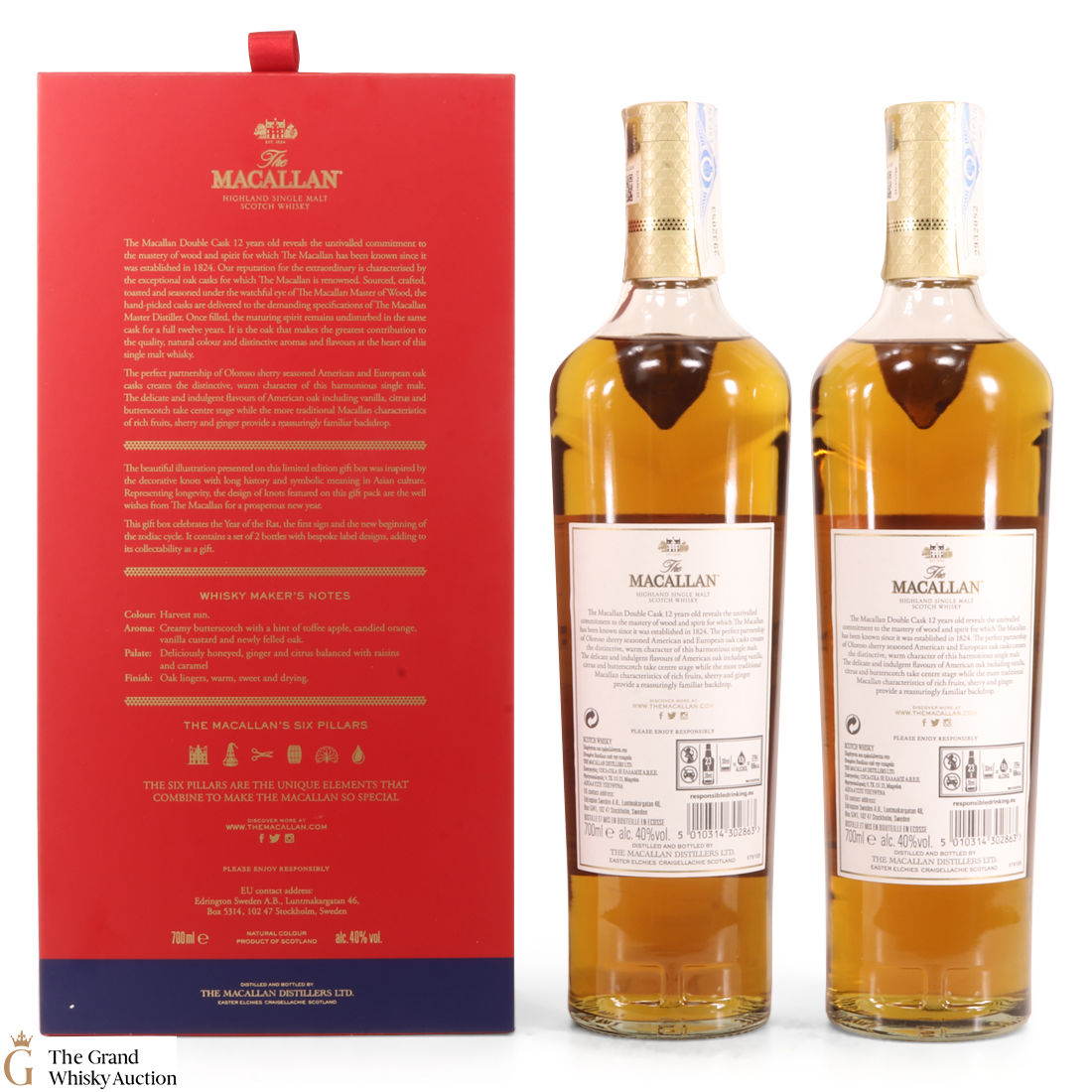 With bespoke label designs, this is an eye-catching limited-edition release twin pack containing 2 x 70cl bottles of The Macallan 12-year-old Double Cask single malt whisky.