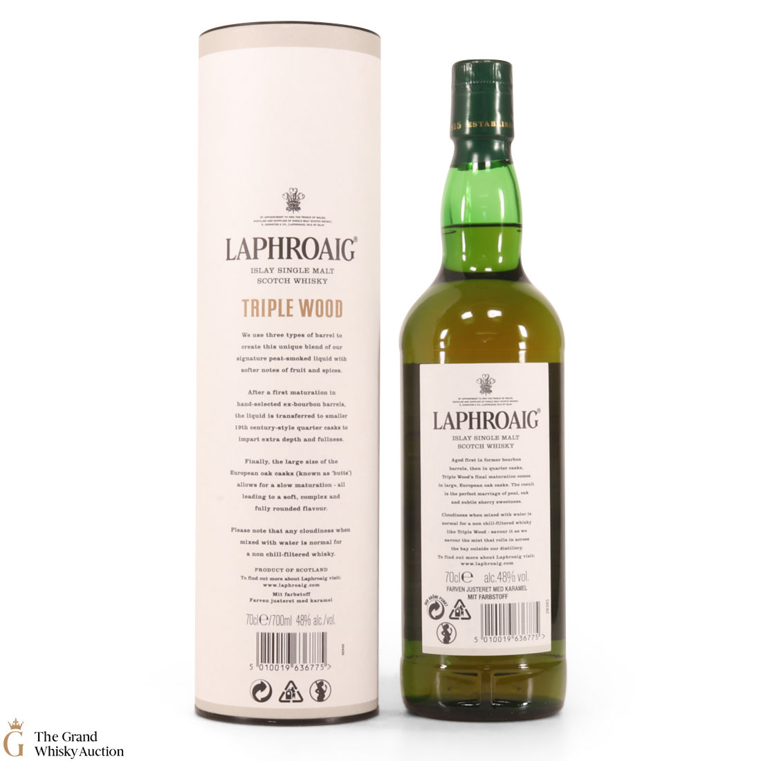 This is a 70 cl bottling of Laphroaig Triple wood. It was originally launched for the duty-free market but the Triple Wood has become a core expression from Laphroaig. The single malt has been triple matured; in bourbon barrels, quarter casks and then Oloroso sherry butts.