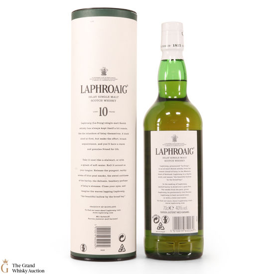 A 70cl of the medicinal 10 year old from Islay's bestselling distillery, Laphroaig. In making Laphroaig, malted barley is dried over a peat fire. The smoke from this peat, found only on Islay, gives Laphroaig its particularly rich flavour.