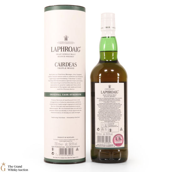Cairdeas, Gaelic for 'friendship', is an annual bottle release by Laphroaig for their Friends of Laphroaig members. This Càirdeas Triple Wood Cask Strength was released for Fèis Ìle 2019. It has had a special triple maturation; first matured in ex-bourbon barrels, then in quarter casks and finally in European oak casks which previously held oloroso sherry.