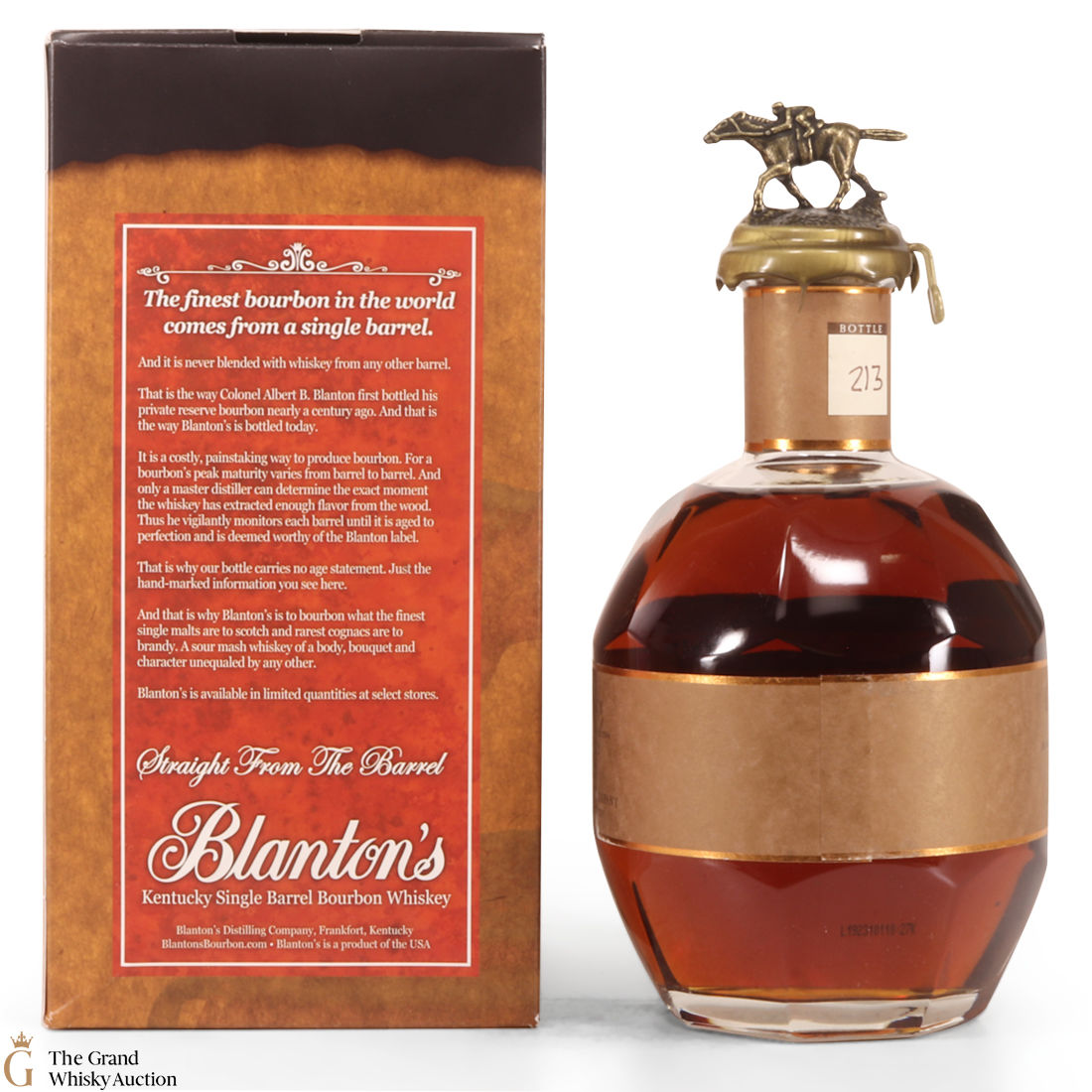 Blanton's Single Bourbon is normally 6 to 8 year old bourbon, aged in Warehouse H at Buffalo Trace in the metal-clad warehouse at the distillery. The metal, transfers heat quicker than brick warehouses, allowing for faster ageing.
