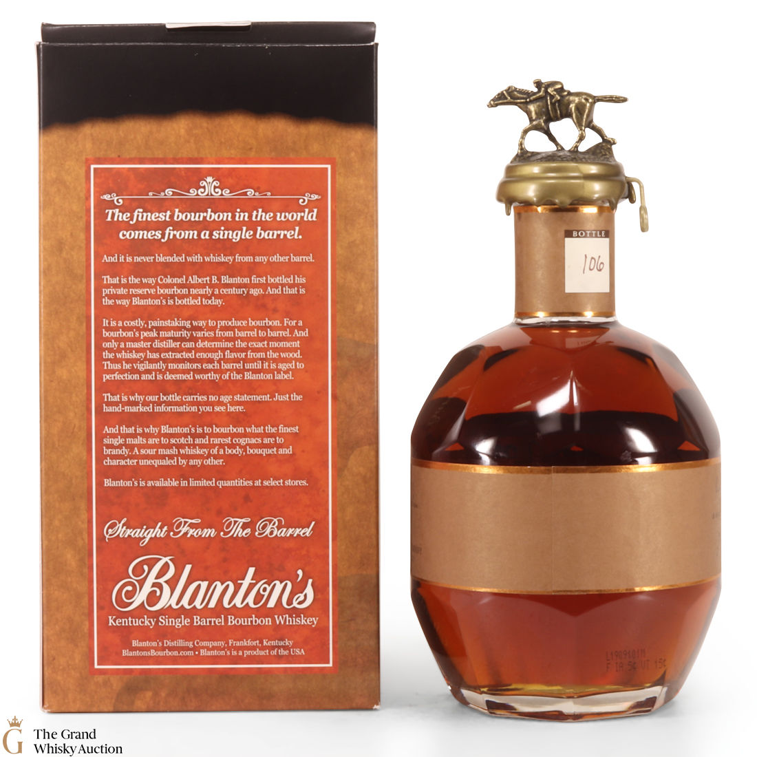 Blanton's Single Bourbon is normally 6 to 8 year old bourbon, aged in Warehouse H at Buffalo Trace in the metal-clad warehouse at the distillery. The metal, transfers heat quicker than brick warehouses, allowing for faster ageing.