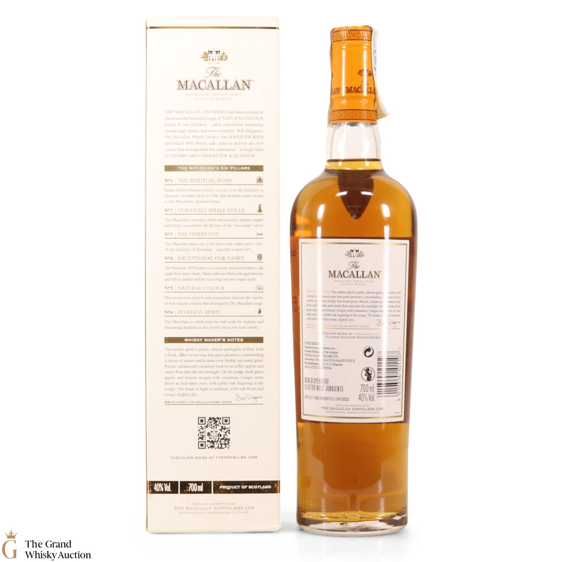 The Macallan 1824 Series celebrates natural colour. The most distinctive and defining characteristic of Macallan is the sherry-seasoned oak casks that are used to mature the whisky. This series shows commitment to 100% natural colour, drawn from wood. The colour of each expression becomes deeper as the range progresses.