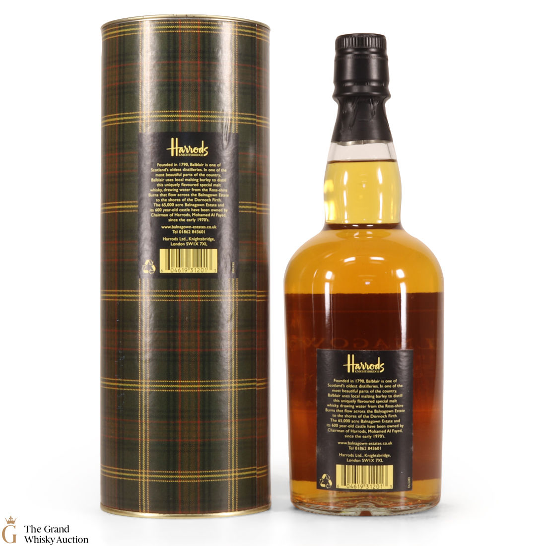 A bottle of Harrod's Balnagown single malt Scotch whisky - a non gestatement Balblair single malt. This bottling is named after the Balnagown Estate in the Highlands of Scotland, which has been owned by Mohammad Al-Fayed (former Chairman of Harrods) since the early 1970s.