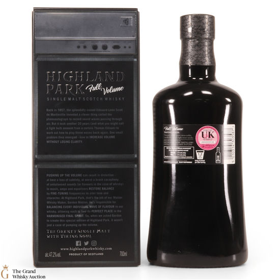 Full Volume by Highland Park was distilled in 1999 and bottled in 2017 from 481 casks. The single malt was matured exclusively in first-fill bourbon casks and was bottled at 47.2% ABV and comes presented in a themed presentation box resembling speaker.