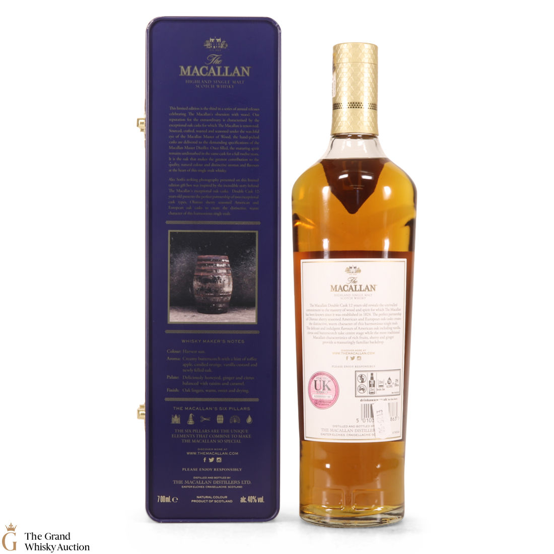 This Macallan 12 Year Old Double Cask matured in a mixture of European and American oak casks that have previously contained Sherry, as well as American oak casks which have contained Bourbon. It comes presented in a limited edition tin.