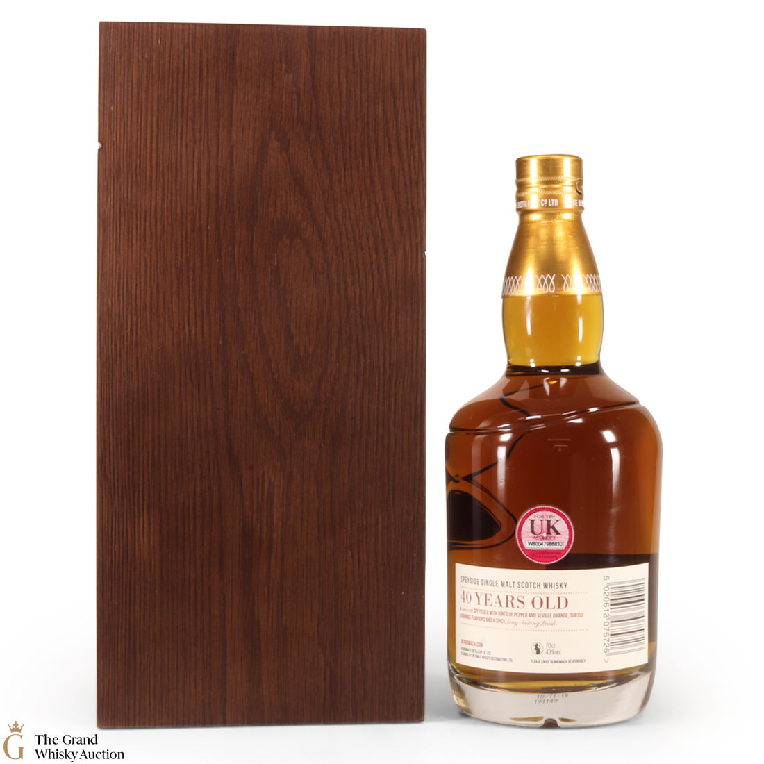 Due to the various ages of bottles and their seals, the condition of liquid is at the buyer's discretion and no claim can be lodged against failure/leakage in transit. Loss and breakage cover is available at 3% of the hammer price as standard. If the lot is not insured, no claim can be lodged against the courier or The Grand Whisky Auction for breakage or loss in transit.