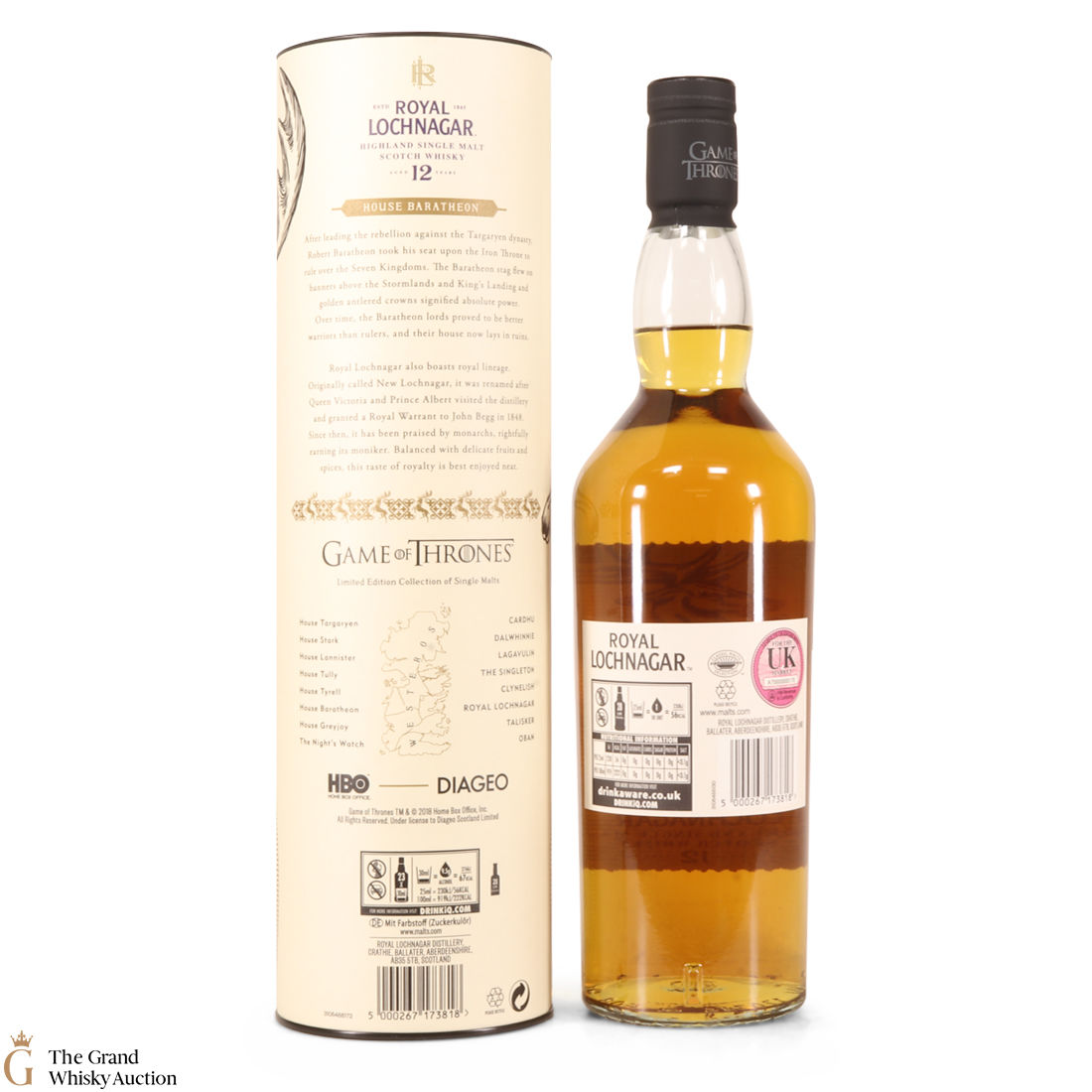 This is a limited-edition 12 year old single malt from Royal Lochnagar and it is part of Diagio's 2018 collaboration with HBO. Each single malt in the series relates to the land of houses of the Game of Thrones television series. The Royal Lochnagar bottle is decorated with a rampant black Stag, the sigil of House Baratheon that once flew on banners above the Stormlands and King’s Landing signifying absolute power.