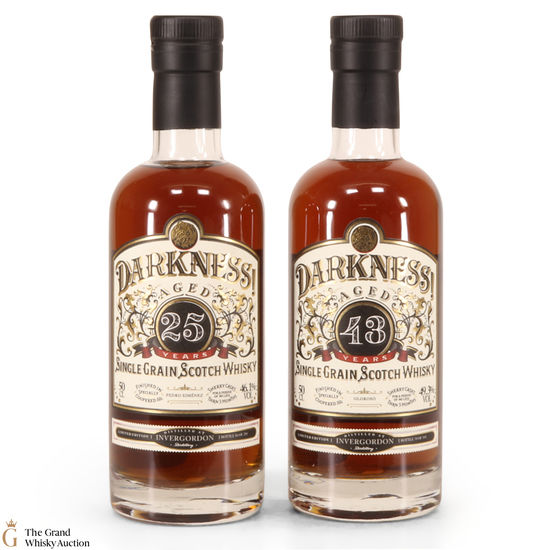 This lot includes 2 x 50cl Invergordon Single Grain whisky bottlings, independently bottled for the Darkness! range.