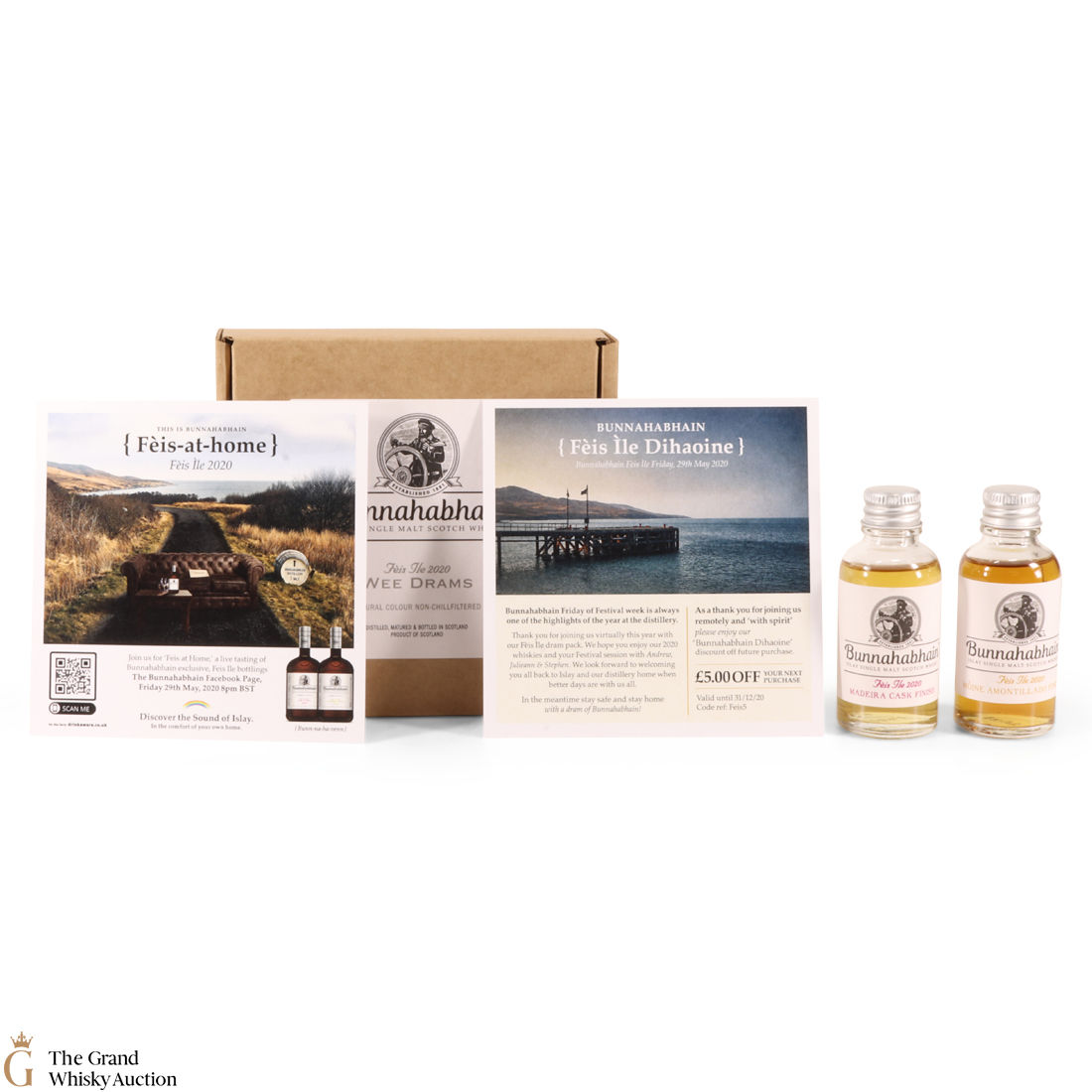 A wee dram pack containing the Bunnahabhain Fèis Ìle 2020 releases – the 2010 Mòine Amontillado Finish (3cl, 56.9%) and the 2002 Madeira Cask Finish (3cl, 53%).