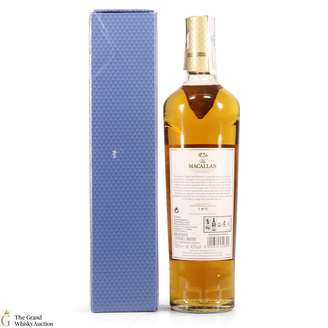 This 15-year-old Macallan single malt was is part of the Triple Cask range (which was brought out to replace the Fine Oak range in 2018). This whisky has been matured for 15 years in a combination of European sherry seasoned casks, American sherry seasoned casks and American ex-bourbon casks.