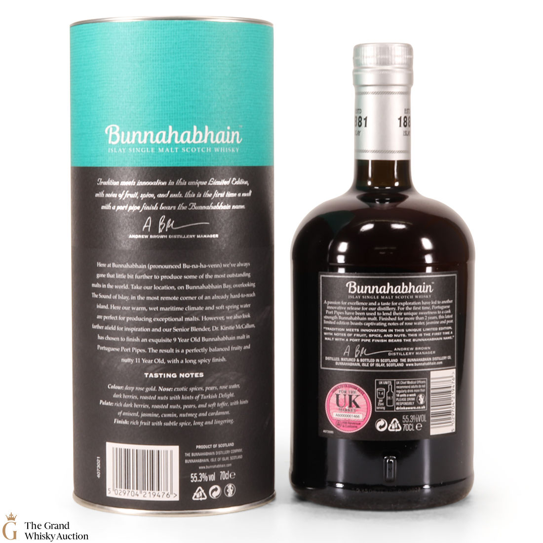 This Bunnahabhain limited release was distilled in 2007 and was aged in Warehouse 8 for 11 years. Initially matured in whisky refill hogshead casks and then filled into port pipes in 2016 for a final 2 years of maturation. It was bottled at 55.3% ABV. This is one of 1578 bottles produced.